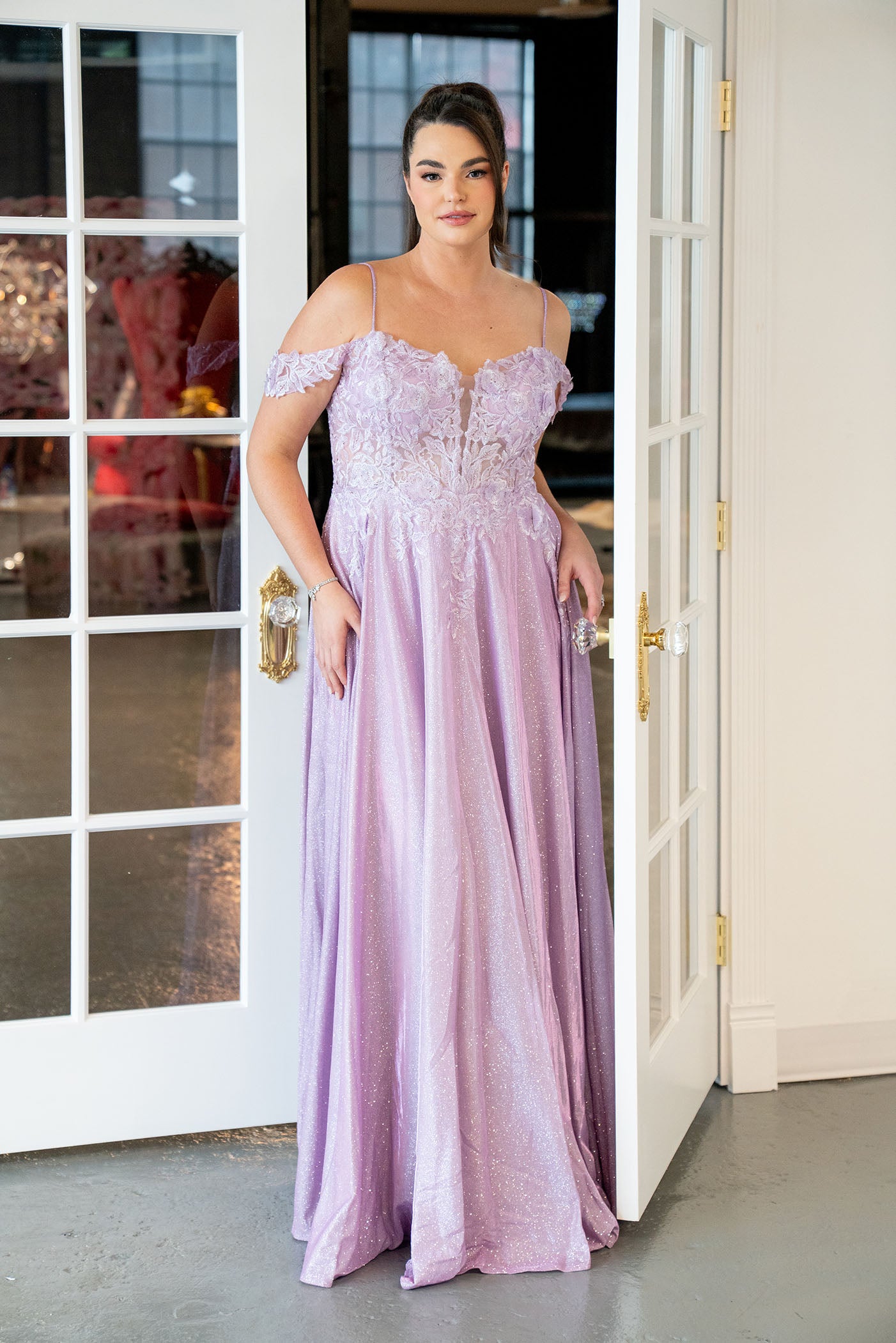 A romantic corset-inspired gown with delicate off-shoulder lace sleeves, a sweetheart neckline with an illusion plunge, and a softly shimmering full-length skirt.